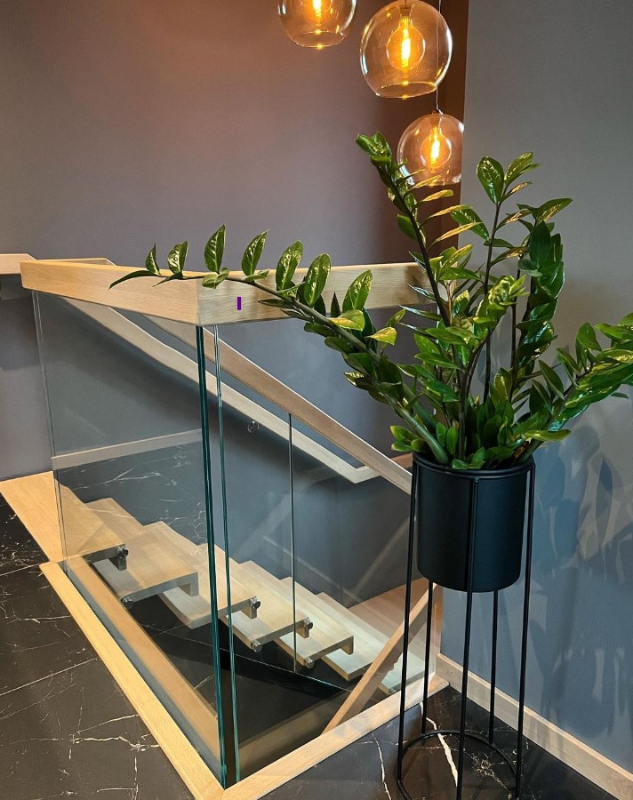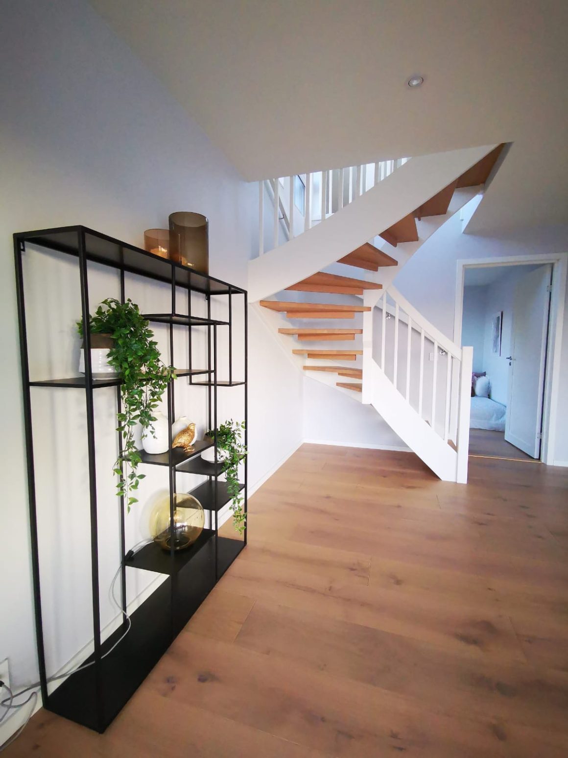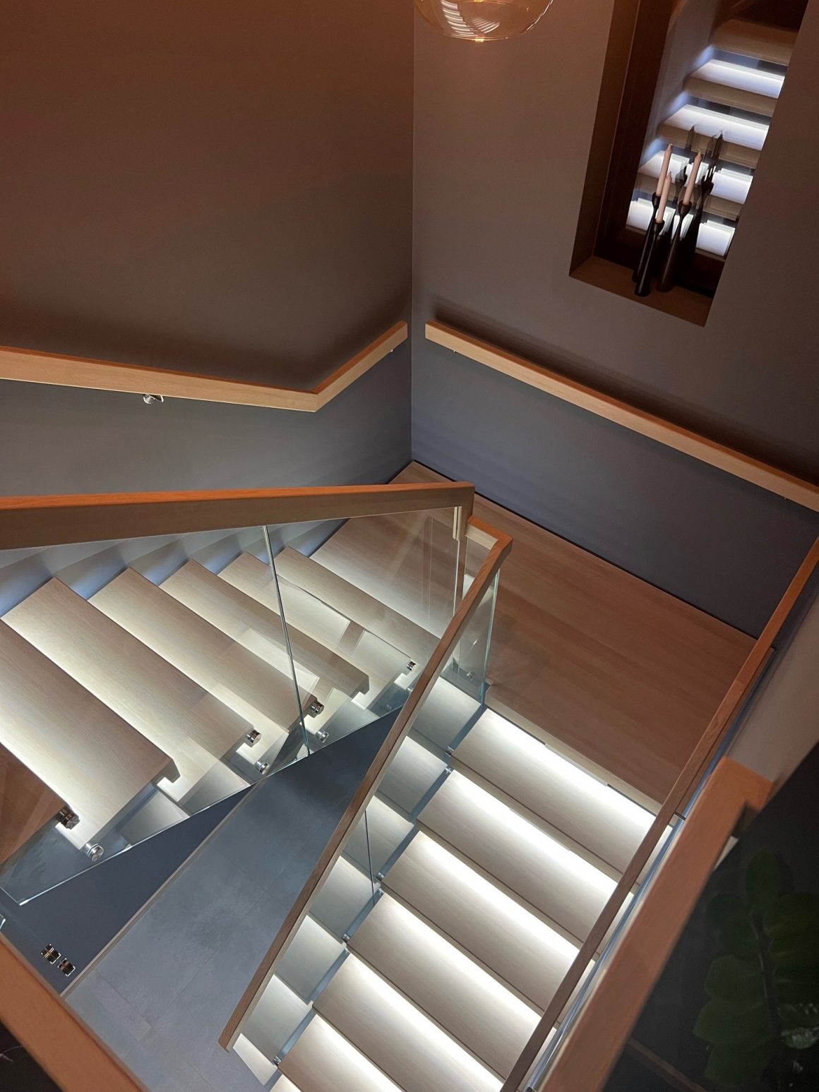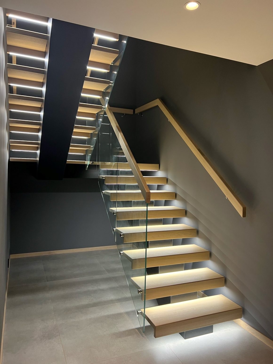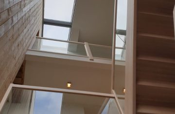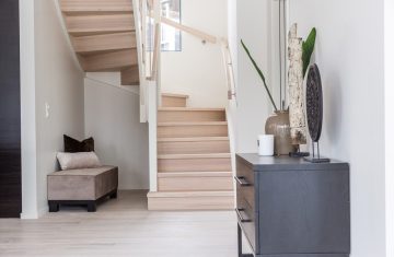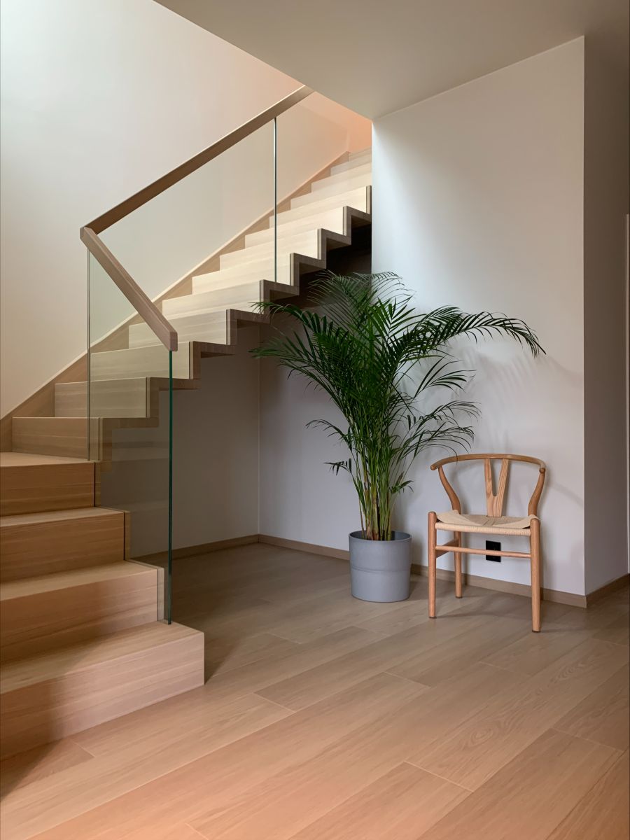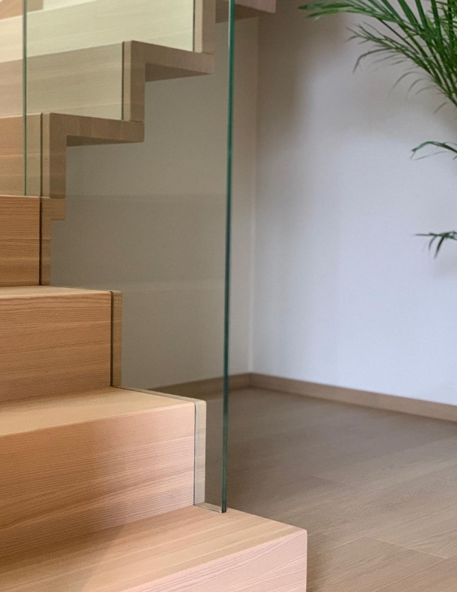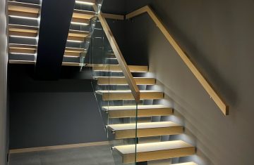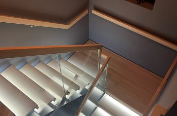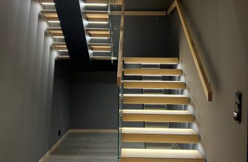 Form: 1/2 (180˚) vinkel Trappetype: åpen Vangetype: C-7, tre Material: beiset og lakkert helstav ask Rekkverket: håndlist i tre på sikkerhetsglass Detaljer: integrert LED