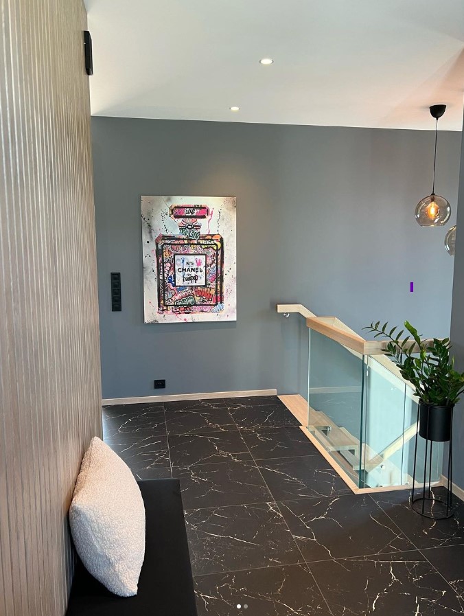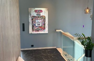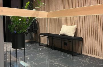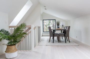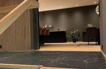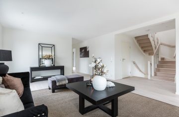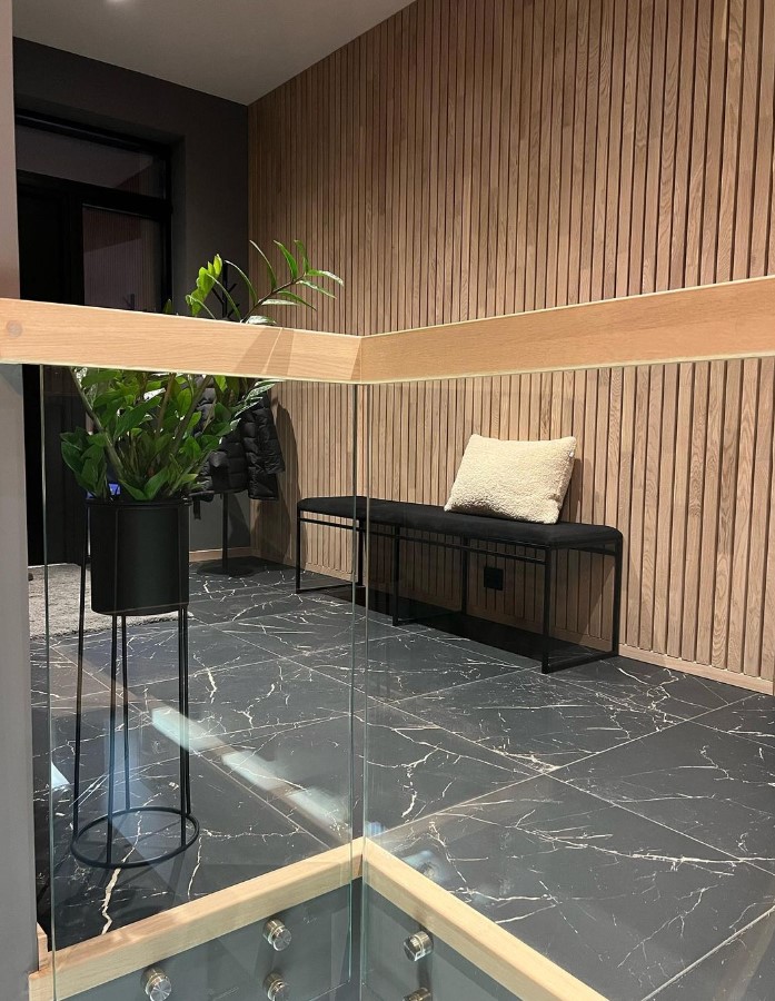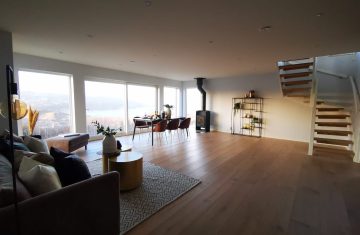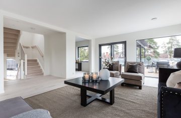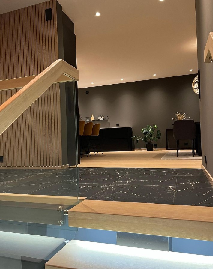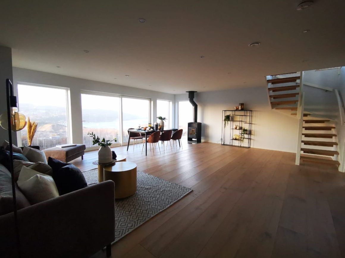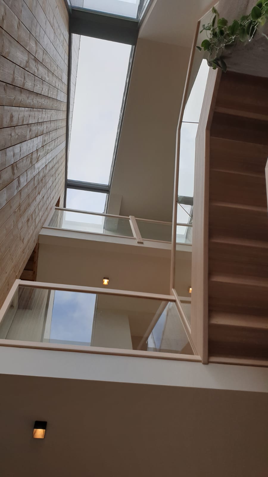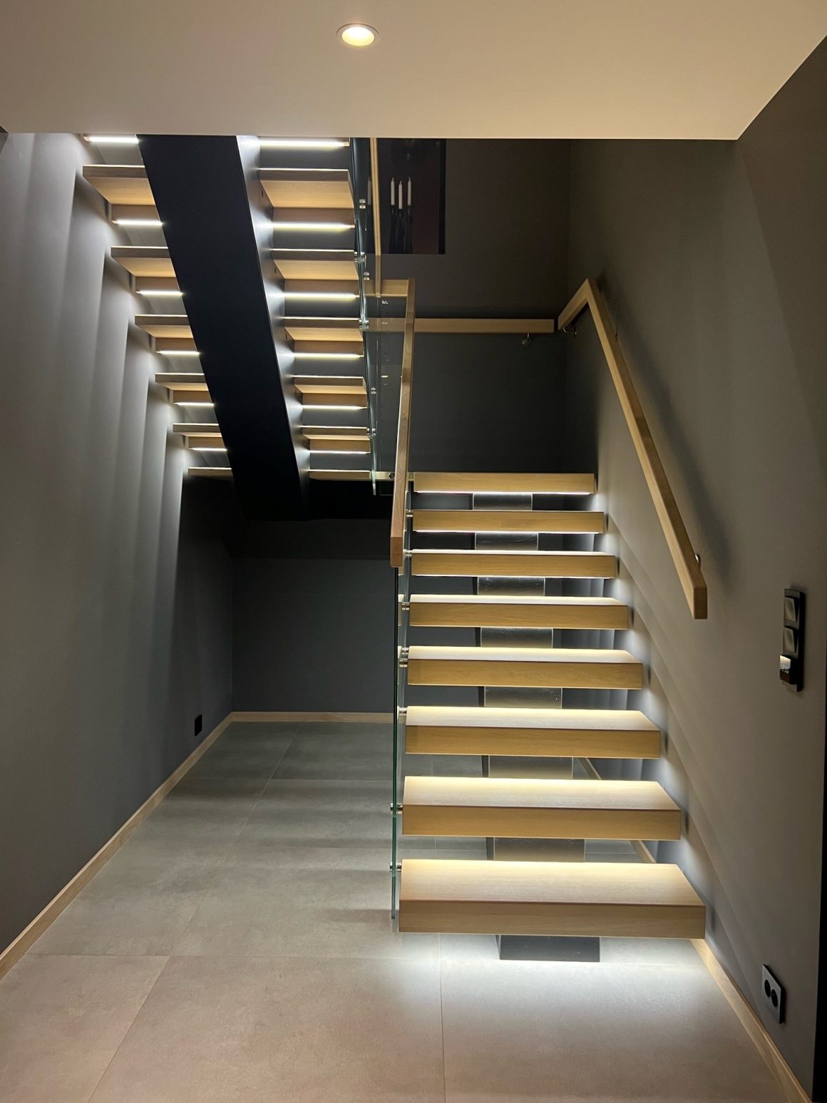 Form: 1/2 (180˚) vinkel Trappetype: åpen Vangetype: C-7, tre Material: beiset og lakkert helstav ask Rekkverket: håndlist i tre på sikkerhetsglass Detaljer: integrert LED