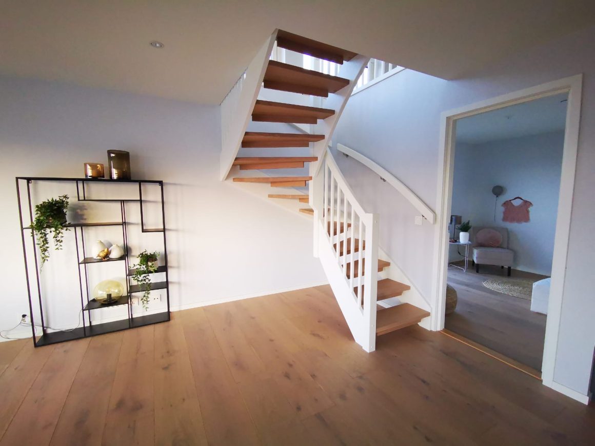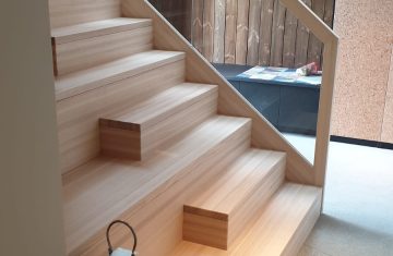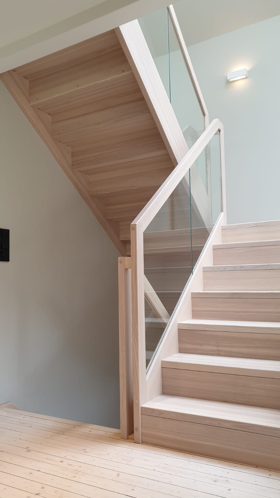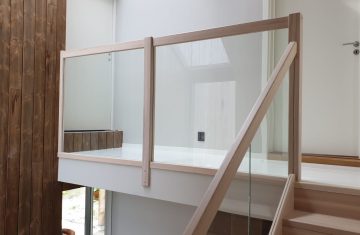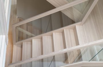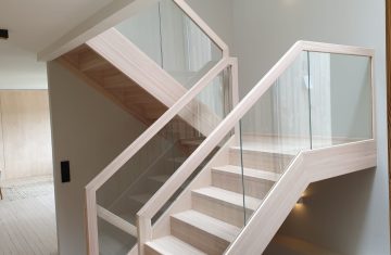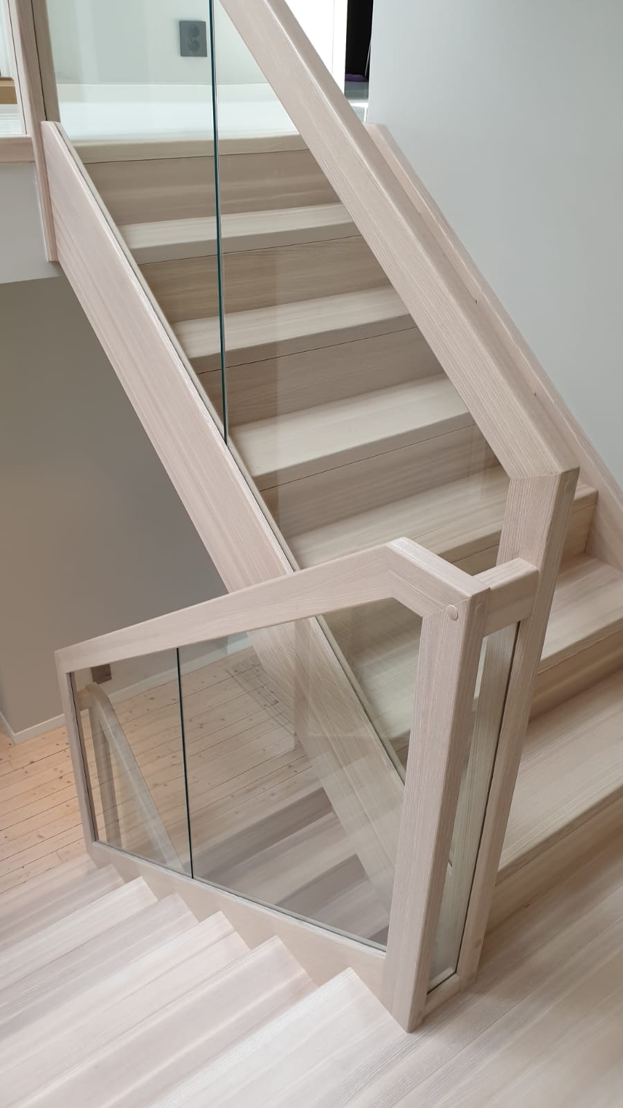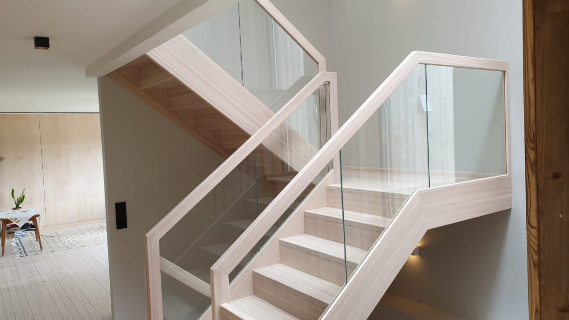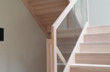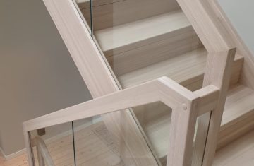 Form: L (90˚) sving Trappetype: lukket, eik Vangetype: C-20, eik Material: beiset helstav eik Rekkverket: håndlist i tre på sikkerhetsglass