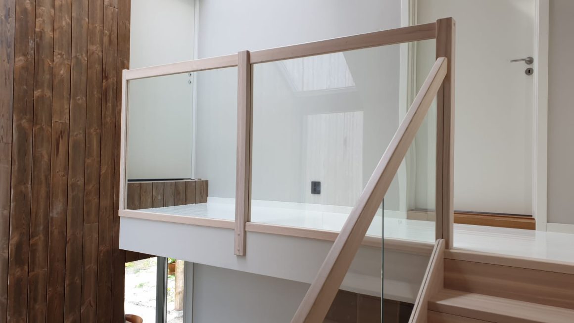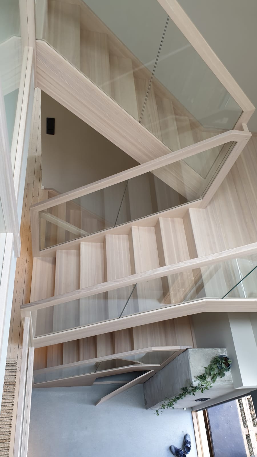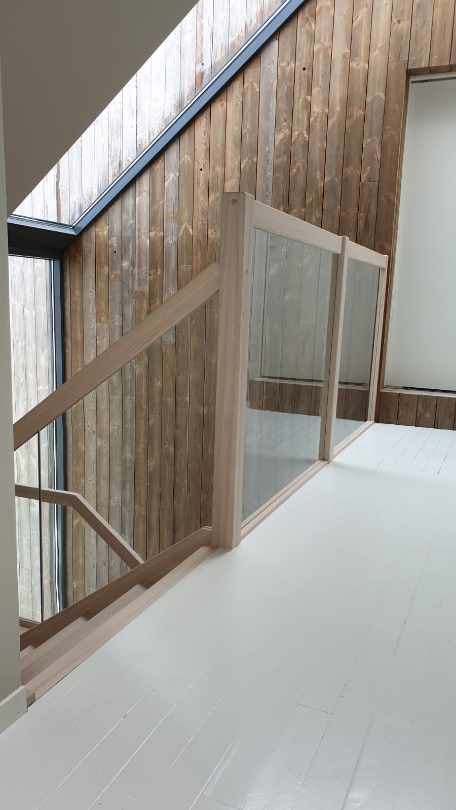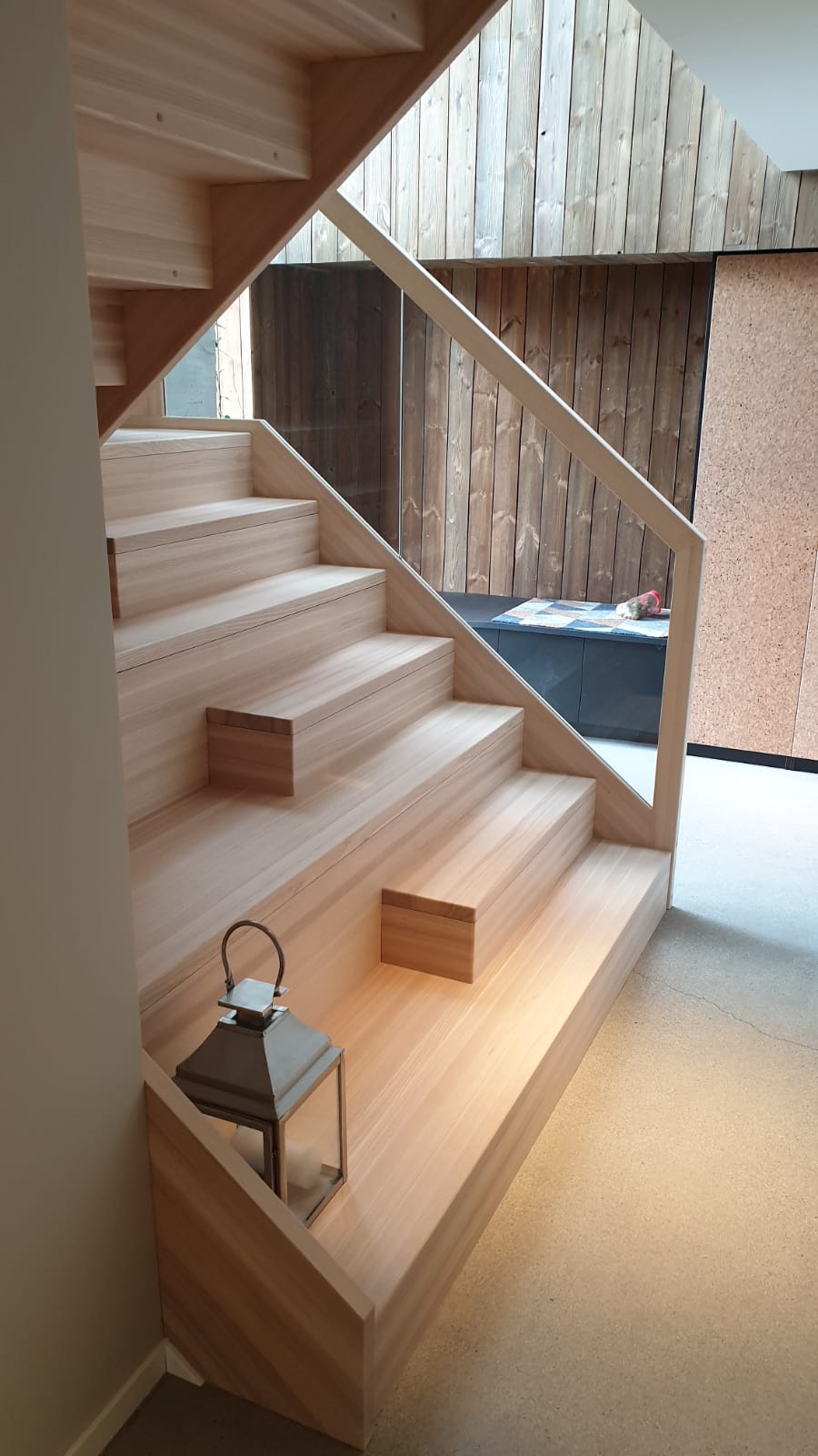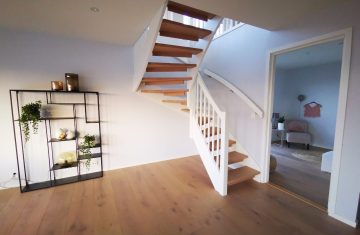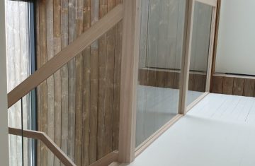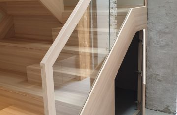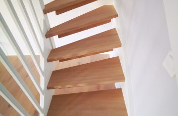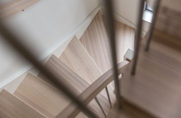 Form: L (90˚) sving Trappetype: lukket, eik Vangetype: C-20, eik Material: beiset helstav eik Rekkverket: håndlist i tre på sikkerhetsglass