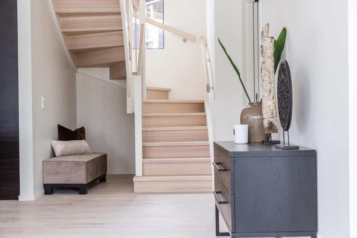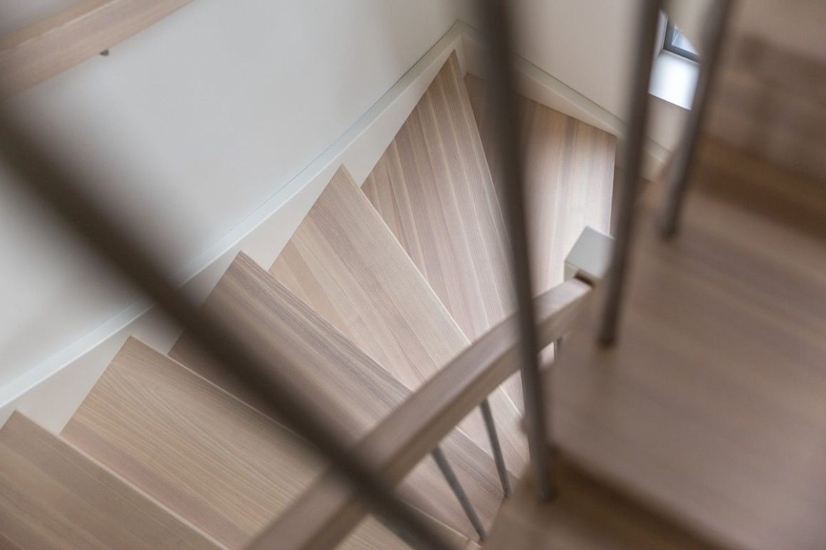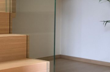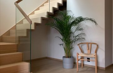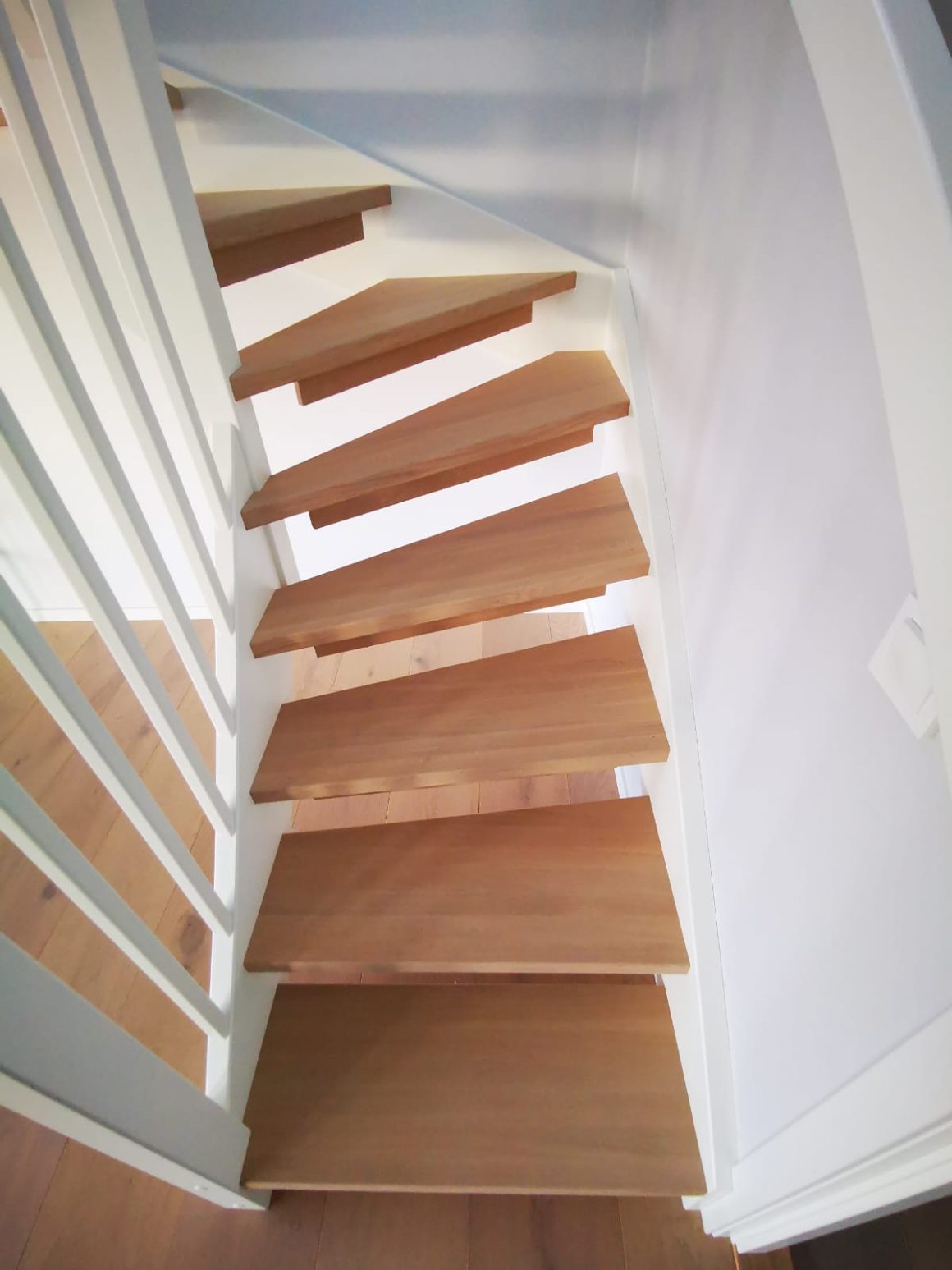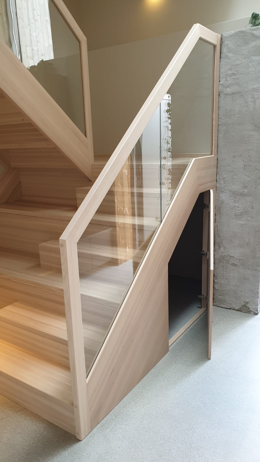 Form: L (90˚) sving Trappetype: lukket, eik Vangetype: C-20, eik Material: beiset helstav eik Rekkverket: håndlist i tre på sikkerhetsglass