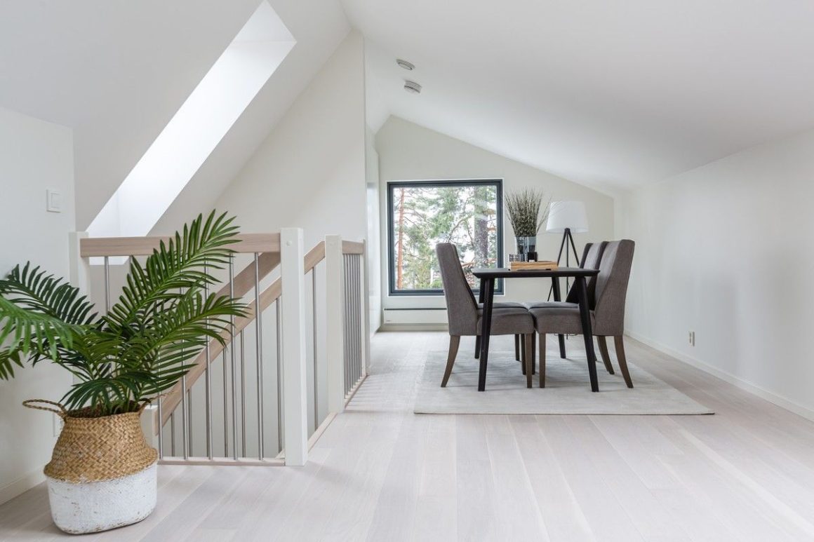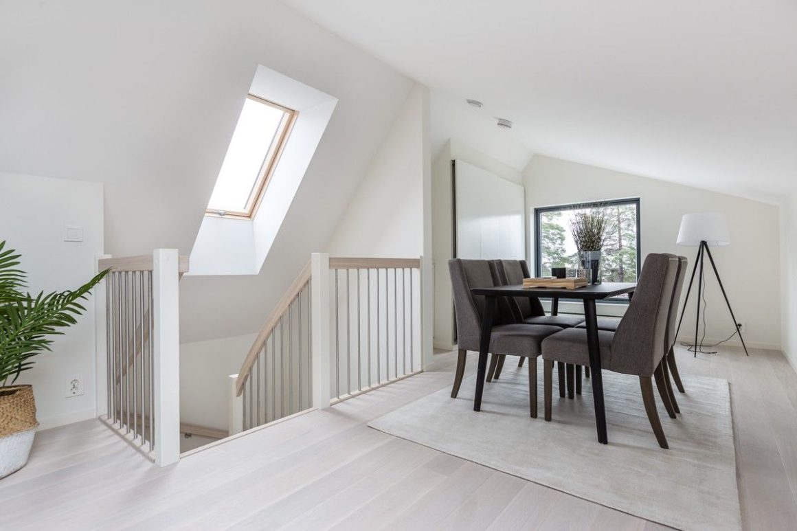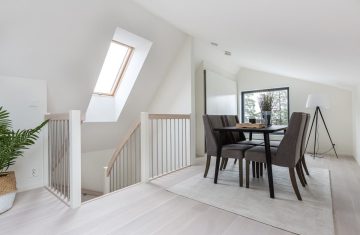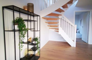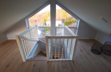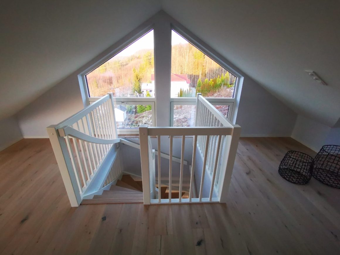 Form: 1/2 (180˚) vinkel Trappetype: lukket Vangetype: C-2, tre Material: beiset helstav ask Rekkverket: håndlist i tre, stålspiler og hvitmalt stolper i tre